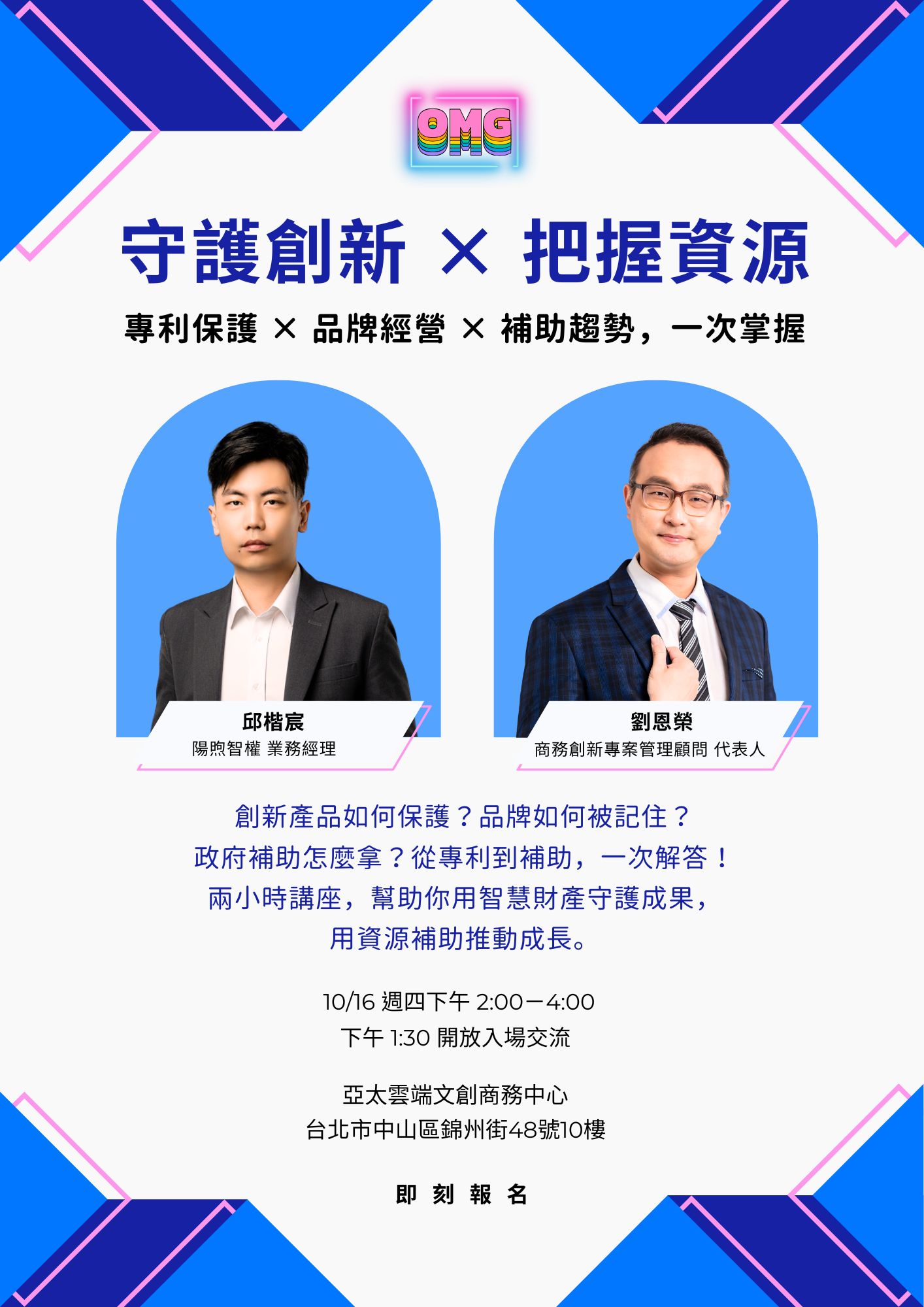 10/16【守護創新 × 把握資源 專利保護 × 品牌經營 × 補助趨勢】OMG教練團-講座資訊分享