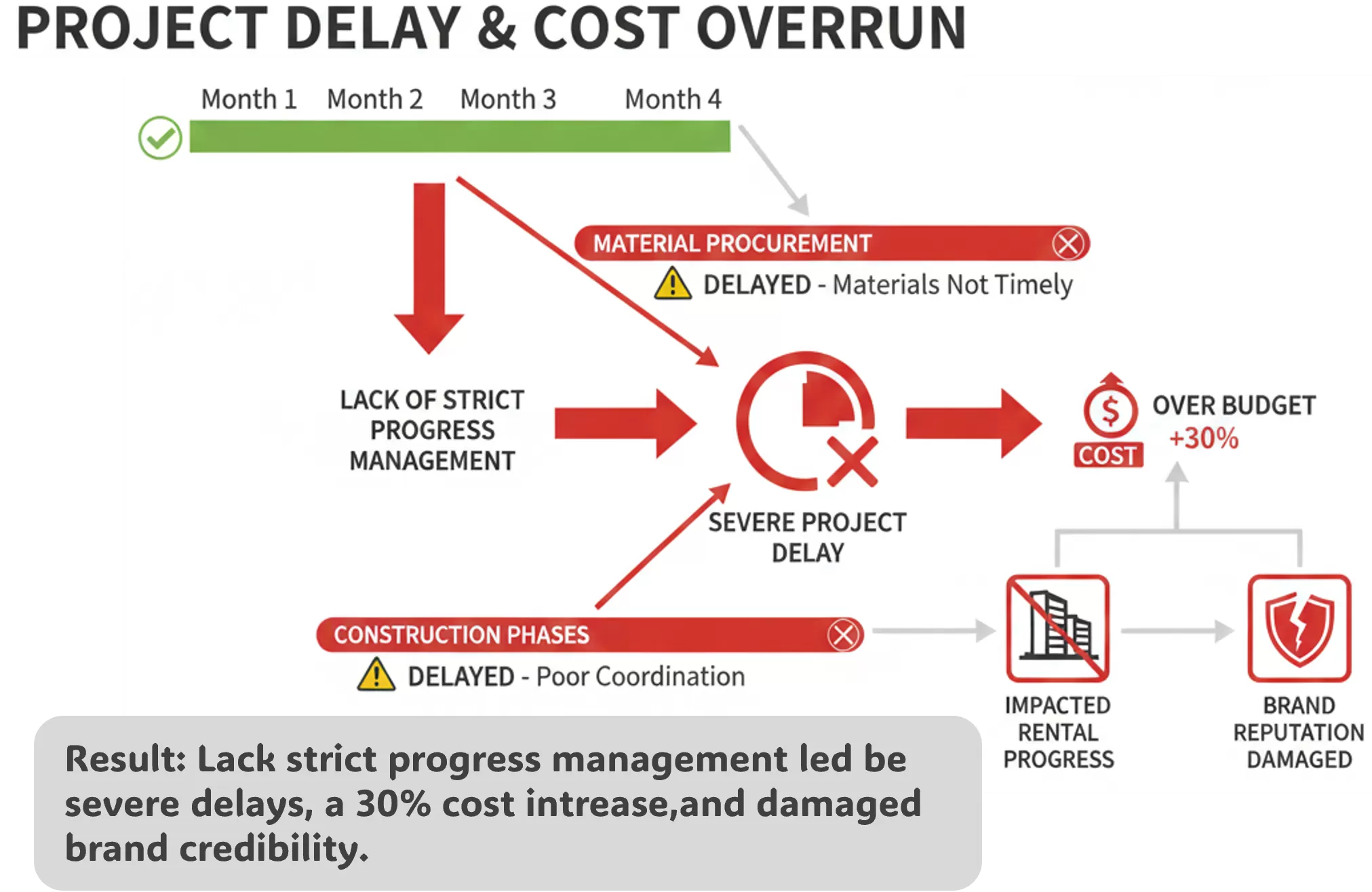 某建築公司承接了一個大型商場的建設工程,但由於缺乏嚴格的進度管理,施工團隊在不同階段無法有效協調,導致關鍵材料未能及時到位,部分工序無法順利進行。最終,該工程不僅嚴重延誤,還因為趕工與錯誤修正而增加了超過30%的額外成本,甚至影響到商場的招商進度,導致品牌信譽受損。