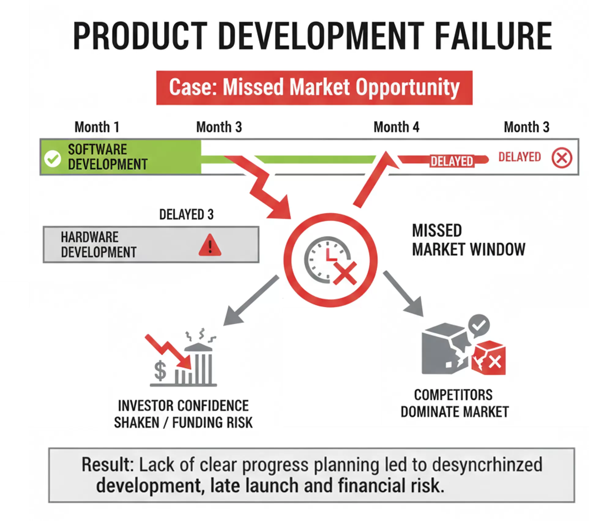 有一家新創科技公司原本計畫推出一款創新的智慧家居產品,但內部團隊缺乏清晰的開發進度規劃,導致程式設計與硬體開發進度嚴重脫節。當產品最終準備上市時,市場上的競品已經佔據主導地位,導致該公司錯失先機,投資人信心動搖,公司面臨資金鏈斷裂的風險。
