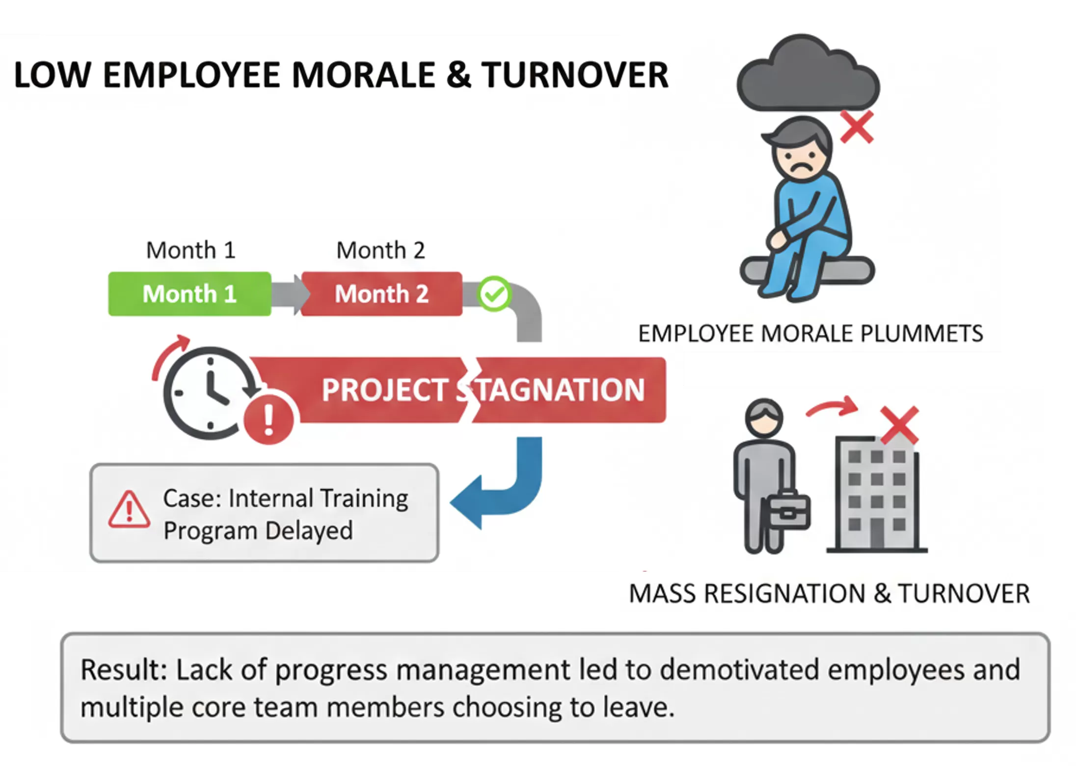 有間企業啟動了一個內部員工培訓與發展計畫,原定六個月內完成,但是因為缺乏進度管理,相關負責人沒有定期追蹤執行狀況,導致培訓內容反覆變更,資源配置不足。員工原本滿心歡喜期待學習與成長,但隨著進度的拖延,逐漸失去信心,認為公司缺乏規劃,最終導致多名核心成員選擇離職。