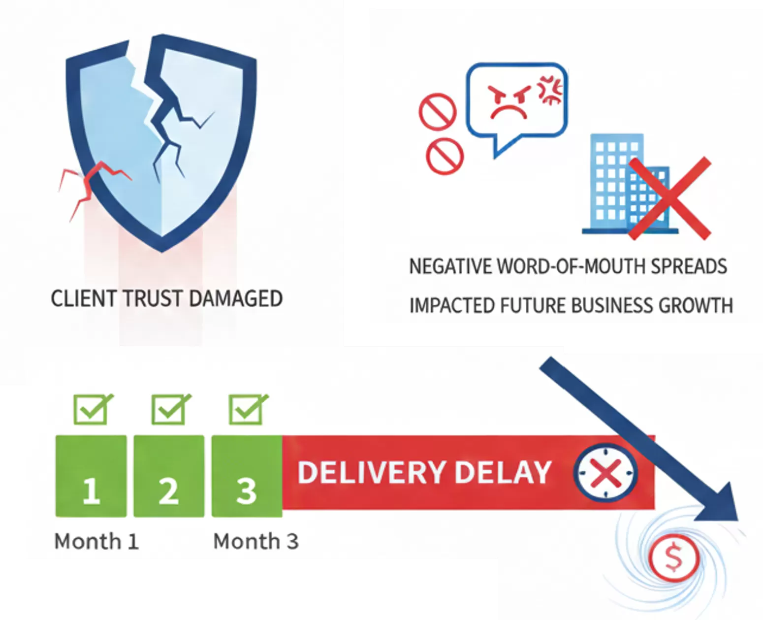 一個設計公司接到客製化品牌包裝設計的訂單,與客戶約定三個月內交付。但由於內部進度管理混亂,設計、修改、打樣等環節頻繁延誤,導致最終的交付時間遠遠超出原定期限。當然客戶對該公司的信任度大幅下降,最終選擇不再合作,甚至在業界傳播負面口碑,影響了公司的未來業務拓展。